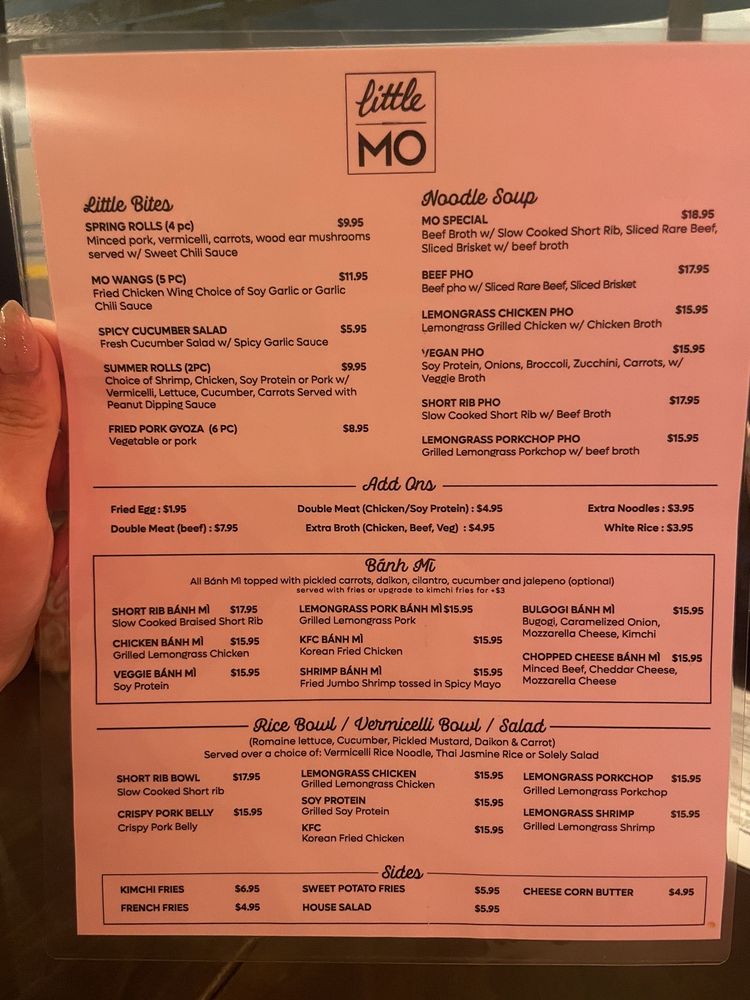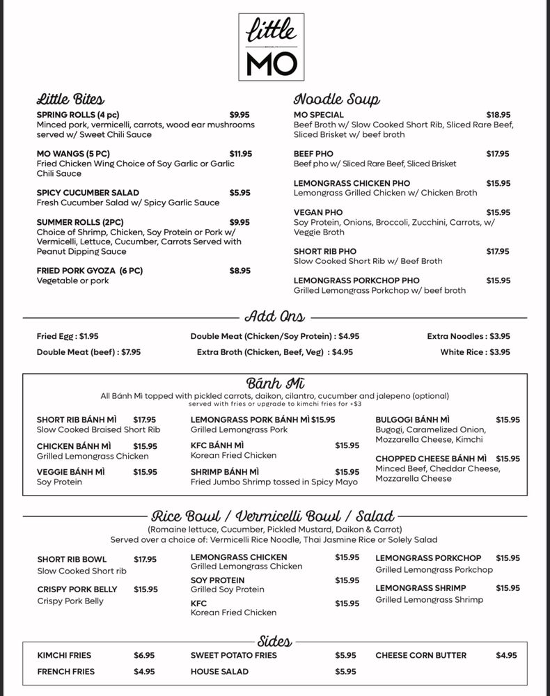 The menu shines with crowd favorites like the Bulgogi Cheesesteak Banh Mi and the rich, hearty Mo Special Pho, both highly praised for their generous portions and bold flavors. Reviews highlight the attentive staff and the trendy, welcoming vibe, making it perfect for brunch, lunch, or dinner.